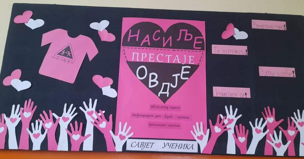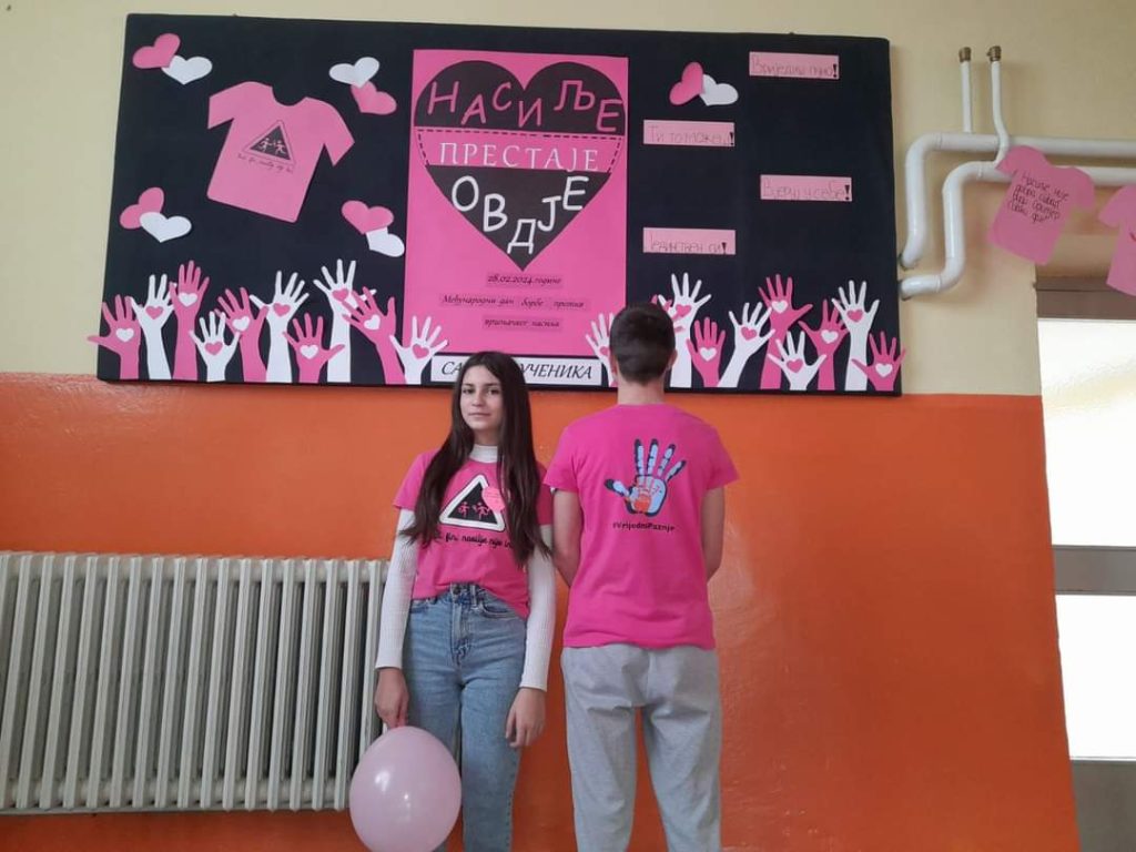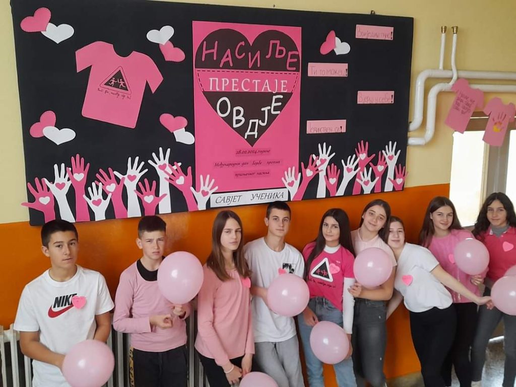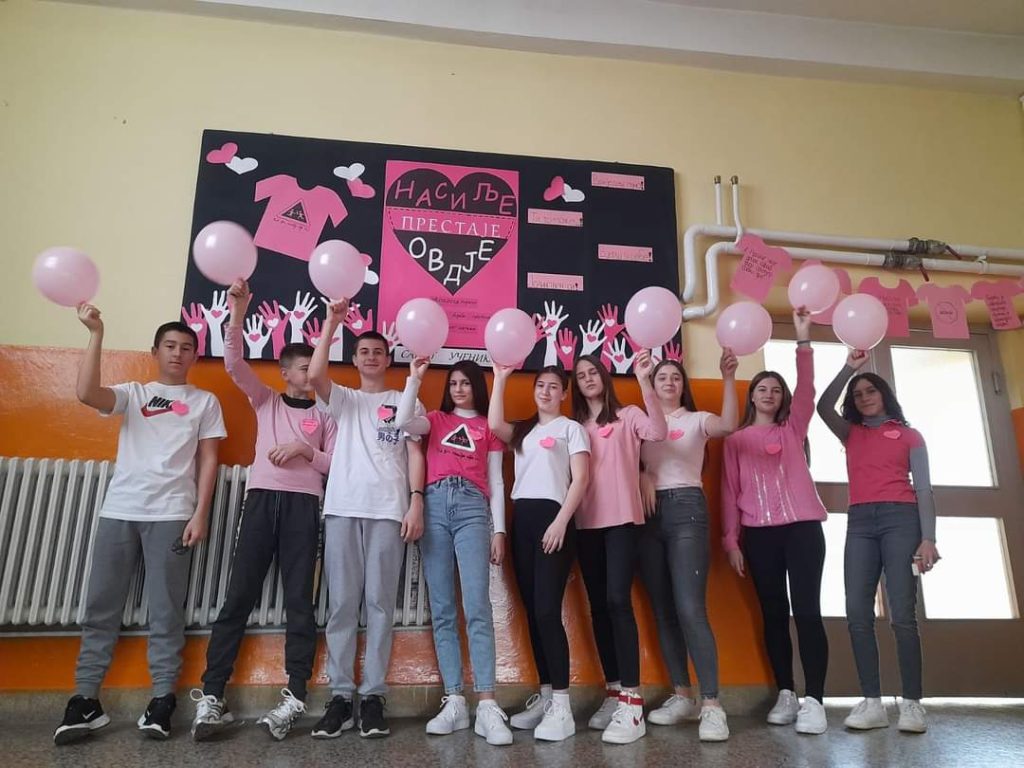 Савјет ученика наше школе данас је провео низ активности поводом обиљежавања Дана ружичастих мајица. Тим поводом ученици су, на пригодан начин, истакли важност дружења, тимског рада, толеранције, подршке и емпатије у борби против вршњачког насиља.